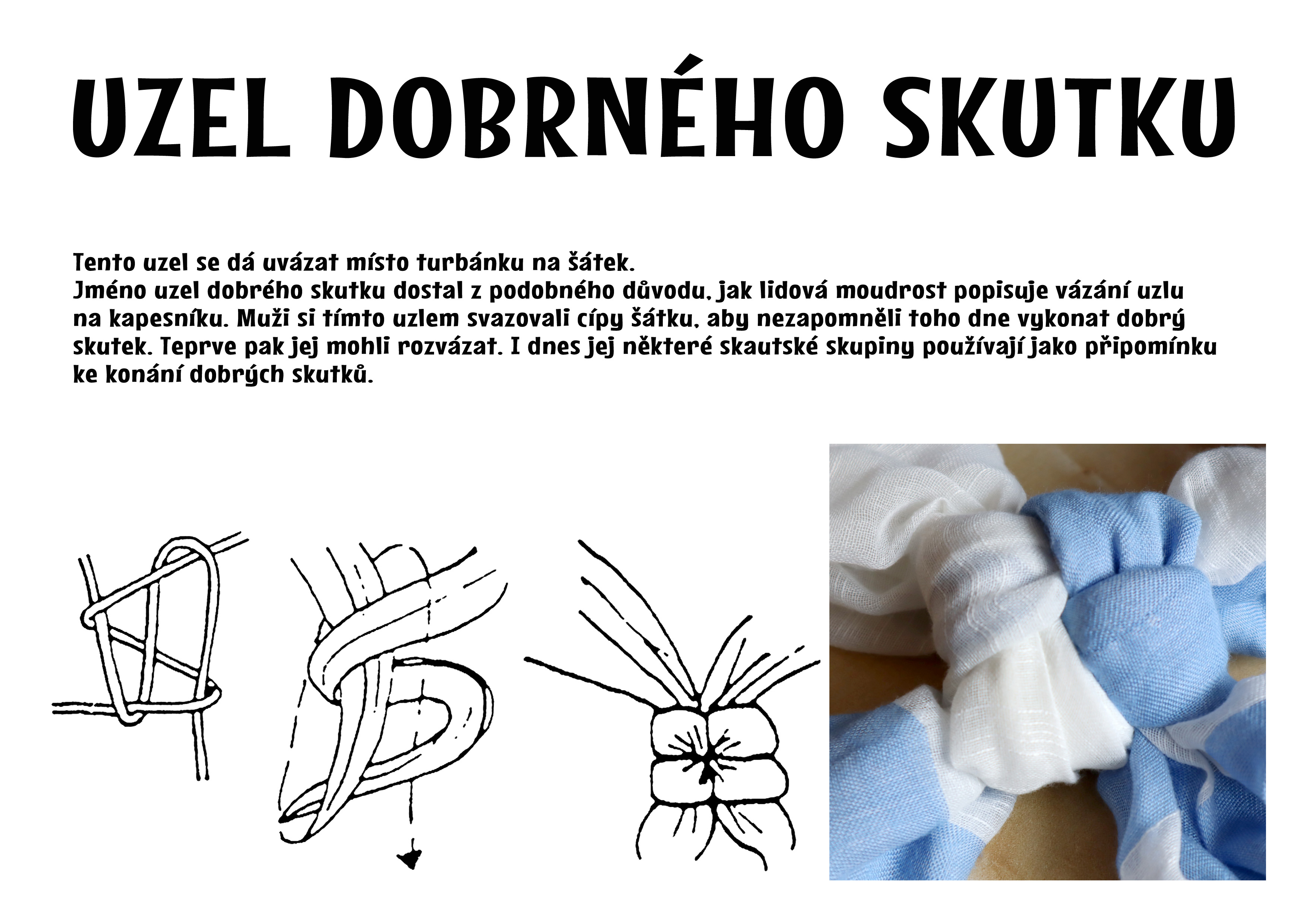 Pokud jsi dítě do 11 let včetně, uvaž 1 z výše uvedených uzlů. Pokud jsi dítě do 15 let včetně, uvaž 2 uzly z výše uvedených uzlů. Pokud jsi kmet, uvaž všechny tři uzly - uzel dobrého skutku, uzel přátelství a uzel opičí pěst, do které zabuduješ kuličku.
